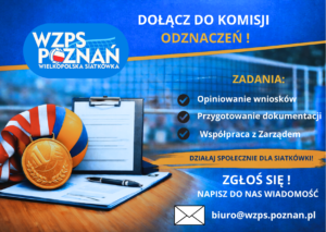Wielkopolski Związek Piłki Siatkowej zaprasza do współpracy w Komisji Odznaczeń! Poszukujemy osób, które chcą zaangażować się w działalność organizacyjną na rzecz środowiska siatkarskiego w Wielkopolsce.